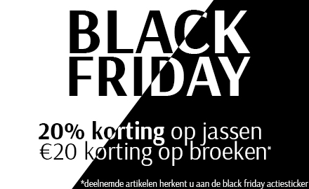 Hier vind u onze Black Friday acties! 20% korting op jassen*. Ook uw nieuwe broek koopt u in de Black Friday sale met €20,- korting! *Deelnemede artikelen zijn reeds afgeprijsd en kunt u herkennen aan de Black Friday actiesticker.